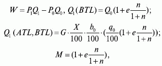 где Q1– объем продаж товара при проведении мероприятия по стимулированию, шт.; Q1(BTL) – объем продаж при стимулировании и рекламе на месте продажи, шт.; Q1(ATL, BTL) – объем продаж при стимулировании, массовой рекламе и рекламе на месте продажи, шт.; G – количество семей, планирующих покупку товара, шт.; X– охват целевого рынка, проценты; b – доля продаж рассматриваемого товара во всем ассортименте товарной категории при постановке эксперимента, проценты; q – доля покупателей среди посетителей, проценты; M – коэффициент роста, зависящий от эластичности спроса e, ед.