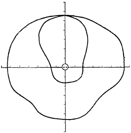 Если у козы удалена ушная раковина, коза почти одинаково слышит все звуки, с какой бы стороны они ни приходили. Ушная раковина делает ухо наиболее чувствительным к звукам, источник которых находится прямо против этой раковины. Шкала отградуирована в относительных единицах, характеризующих чувствительность уха.