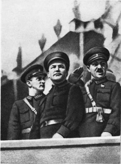 С. М. Киров, М. Н. Тухачевский и И. Е. Славин во время перво майской демонстрации трудящихся Ленинграда (1930 г.)