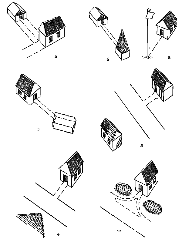 Дерево или группа деревьев, растущие за домом, обеспечивают его защиту (рис. 27 д). Крупные высокие экземпляры принято выращивать на участке с северной стороны, где достаточно места. Они символизируют силу и прогресс. Но необходимо следить, чтобы эти деревья не нарушили соотношения горизонтальных и вертикальных масс, инь и ян. Такие деревья не должны расти слишком близко к стенам, чтобы не создавать помех для проникновения в дом ци.