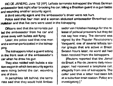 Бразильские левые террористы, убив охранника, похитили посла ФРГ. Рио-де-Жанейро, 12 июня (АП). Левые террористы в эту ночь похитили западногерманского посла, остановив его машину, убив в перестрелке охранника-бразильца и ранив другого охранника. Третий охранник и водитель машины не пострадали. Полиция сообщила, что посла Эренфрида фон Голлебена увезли четверо мужчин и одна женщина и что похитители ехали на пяти машинах. Офицеры полиции говорят, что посла вытащили из его машины и увезли, когда перестрелка еще продолжалась. Позже полиция сообщила, что в похищении участвовали девять мужчин и одна женщина. Похитители убили охранника, сидевшего на переднем сиденье, в тот момент, когда он доставал пистолет. Они также обстреляли автомобиль, в котором ехали два охранника, сопровождавших посольскую машину, и одного из них ранили. В оставленных террористами листовках говорится, что они будут держать посла фон Голлебена в качестве заложника, чтобы обменять его на политзаключенных, однако количество последних не указано. Требование подписано Народным Революционным Авангардом, одной из нескольких террористических групп, действующих в Бразилии. Шестнадцать часов спустя от похитителей еще не было получено никаких новых заявлений. [Рейтер сообщает, что в редакцию «Жорнал до Бразил», ежедневной газеты, выходящей в Рио-де-Жанейро, позвонил неизвестный, предположительно, один из похитителей. Он сказал, что на пригородной железнодорожной станции оставлено письмо. Полиция ведет расследование.] (Англ.)