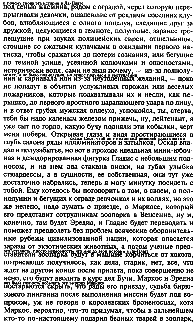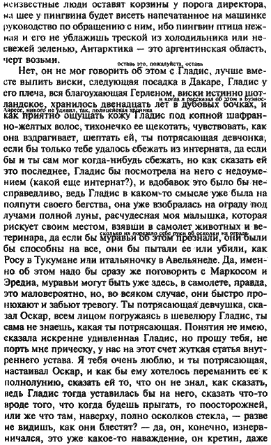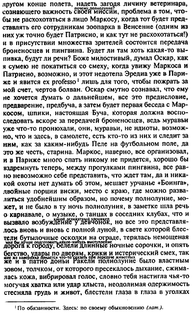 Бывало, что мой друг не всегда был в курсе деятельности наших ребят; он, например, понятия не имел о том, что суровые представители зоопарка в Венсенне изберут Лонштейна вести машину североамериканской марки, взятую напрокат в Герце, с предварительным уточнением цвета и характеристик, соответствующих важности церемониала. Чтобы понять что-нибудь в пересказе раввинчика, всегда требовалось его текст расшифровывать, но на сей раз симфонический размах лонштейновского восприятия уложил моего друга в постель на несколько дней, хотя он никогда не пожаловался на то, что узнал о выгрузке королевских броненосцев и бирюзового пингвина по изложению, жанр коего Лонштейн определил как плюраспектро-мутантный, – короче говоря, броненосцы, вступив на французскую землю, видимо, почувствовали себя неуютно, зато пингвин тотчас проявил опасную резвость, стал биться о стенки контейнера, несмотря на укротительские свистки Оскара и воду с экванилом, которой его напоила Гладис, едва «Боинг» вошел в предварительную фазу приземления и капитан Педернера голосом Пепиты пожелал уважаемым пассажирам счастливого пребывания в Париже.