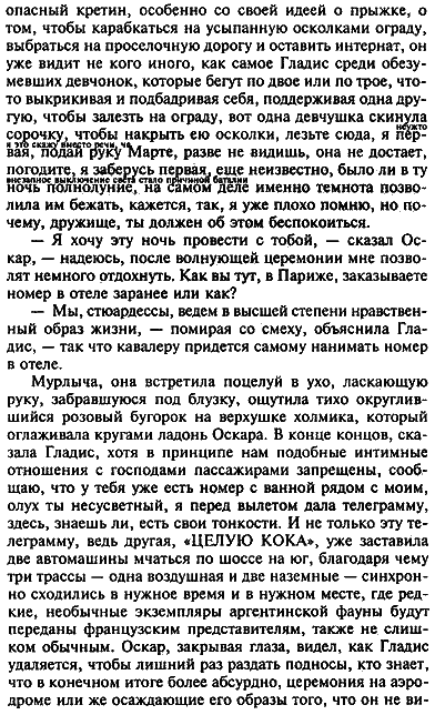 Как часто мы что-то делаем шутки ради или считая это шуткой, а потом, когда исподволь, постепенно начинается настоящее дело, эта шутка, или каламбур, или случайная выходка вновь и вновь вторгается в то, что шуткой отнюдь не является, и, взобравшись на житейский постамент, диктует оттуда лукавые приказы, нарушает ваши движения, разлагает мораль, – во всяком случае, Оскар шутки ради послал Маркосу газетную вырезку о бунте девочек в Ла-Плате и на время совершенно об этом забыл, так как подготовка контейнеров на службе у Гладис была делом долгим и деликатным, и Гладис порой еще прекращала обивку контейнеров, чтобы растормошить Оскара, который отвечал тем же, а потом они принимали душ, и пили, и слушали сообщения по радио, и спускались поесть, но воспоминание о бунте снова пробивалось наверх, образы, возникшие при обычном чтении хроники, оседали в уме, как образы снов, которые не желают выселяться, несмотря на все протесты рассудка. У Гладис, которая тоже читала эту вырезку, был более рациональный взгляд на вещи, и намеки Оскара она считала следствием усталости или нервного состояния, то и другое обычно идут в паре, и отвлекала его от навязчивых мыслей легким умственным толчком, Оскар начинал смеяться и прятал еще одну пачку долларов, made by стариком Коллинсом, в двойную стенку контейнера, готовился к сварке стенок, ходил приласкать бирюзового пингвина, который, с прошлого вечера поселившись в ванной, принимал душ вместе с людьми, радостно хлопал крыльями и уплетал за милую душу свою порцию хека. Королевские броненосцы в тот же вечер прибыли из Чако, и в Эсейсу следовало приехать к одиннадцати утра, в последний суматошный момент, а тут еще из-за служебных перестановок вдруг изменяют дежурства стюардесс, и вдруг раздается звонок заместителя начальника диспетчерской, он предупреждает Гладис, что, мол, ей придется лететь ночным самолетом в Нью-Йорк, по Гладис оказалась неподражаема в драматически-астроло