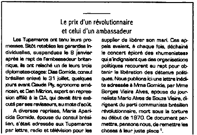 Мария Апарасида Гомиде, жена бразильского консула, многократно обращалась к тупамаро письменно, по радио и по телевидению, умоляя освободить ее мужа. Ее призывы всякий раз вызывали жалостливый хор «гуманистов», негодовавших, что политические организации прибегают к похищению, дабы добиться освобождения политзаключенных. Мы здесь приводим неопубликованное письмо, посланное сеньоре Гомиде сеньорой Борхес Виэйра Алвеш, женой журналиста Марио Алвеша де Соуса Виэйры, руководителя бразильской революционной коммунистической партии, погибшего под пытками в начале 1970 года. Этот документ, думается нам, поможет правильной оценке событий (франц.).