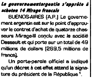 Аргентина. Аргентинское правительство собирается закупить 14 французских «Миражей».Буэнос-Айрес (АП). Аргентинское правительство готово одобрить контракт по приобретению четырнадцати истребителей «Мираж-ІІІ», заключенный с компанией «Дассо» на сумму 49 миллионов долларов (269,5 миллионов франков).