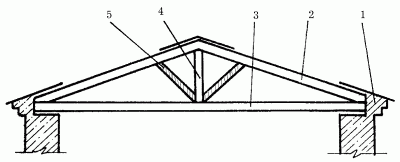 Рис. 35. Висячие стропила: 1 – мауэрлат; 2 – стропильная нога; 3 – затяжка; 4 – бабка; 5 – подкос.