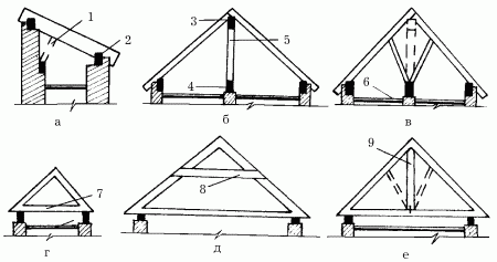 Рис. 36. Различные конструкции стропильных перекрытий: а – при пролете до 5 м; б, д – до 8 м; в, е – до 10 м; г – до 6 м; 1 – стропильная нога; 2 – мауэрлат; 3 – коньковый прогон; 4 – лежень; 5 – стойка; 6 – перекрытие; 7 – затяжка; 8 – ригель; 9 – бабка.