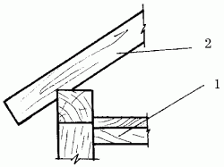 Рис. 37. Опирание наслонных стропил в деревянных брусчатых или рубленых зданиях: 1 – шип; 2 – стропильная нога.