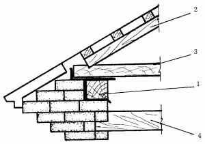 Рис. 39. Опирание наслонных стропил в каменных зданиях: 1 —мауэрлат; 2 – стропильная нога; 3 – затяжка; 4 – чердачное перекрытие.