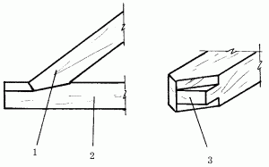 Рис. 40. Соединение стропил зубом и шипом: 1 – стропильная нога; 2 – затяжка; 3 – шип.