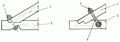Рис. 42. Соединение стропил болтом и хомутом: 1 – стропильная нога; 2 – затяжка; 3 – болт; 4 – хомут.