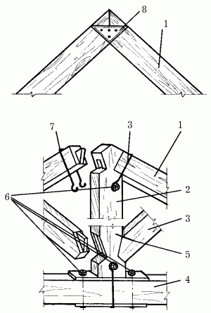 Рис. 43. Коньковый узел: а – упрощенный; б – сложный: 1 – стропильная нога; 2 – стойка; 3 – подкос; 4 – затяжка; 5 – скоба, 6 – болт; 7 – стяжка; 8 – косынка.