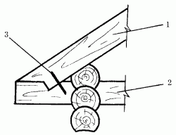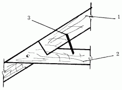 Рис. 44. Соединение ригеля и стропильной ноги: 1 – стропильная нога; 2 – ригель; 3 – скоба.