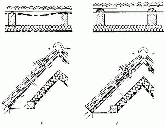 Рис. 47. Изоляция между стропилами: а – с прокладной лентой; б – с деревянной обшивкой и защитным слоем; 1 – прокладная лента; 2 – контрбрусья; 3 – обрешетка; 4 – теплоизоляция; 5 – гидроизоляция; 6 – черепица; 7 – вентиляционный конек; 8 – деревянная обшивка; 9 – защитный слой.
