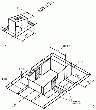 Рис. 58. Заготовка воротника дымовой трубы: а – общий вид дымовой трубы; б – детали воротника, подготовленные к укладке; Ду – длина дымовой трубы по уклону; Ш – ширина дымовой трубы; У – угол между стенкой трубы и скатом крыши (размеры даны в мм).