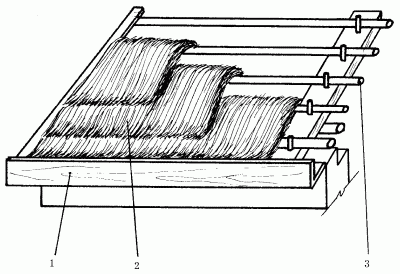 Рис. 78. Покрытие ската: 1 – временная упорная доска; 2 – соломенные снопики; 3 – жерди обрешетки.
