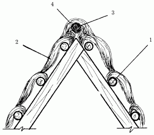 Рис. 79. Покрытие конька: 1 – жерди обрешетки; 2 – выравнивающий пучок глиносоломы; 3 – круглый пучок; 4 – плоский, накрывающий пучок глиносоломы.