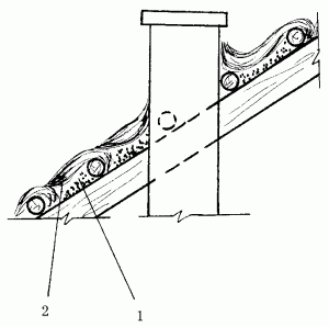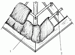 Рис. 81. Покрытие разжелобков: 1 – соломенные снопики; 2 – нагели крепления жердей и брусьев обрешетки.