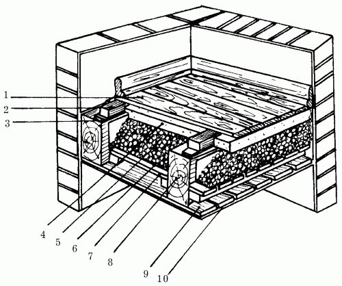 Рис. 89. Деревянное балочное перекрытие: 1 – чистовое покрытие; 2 – лаги; 3 – звукоизоляционный слой; 4 – засыпка; 5 – старая засыпка; 6 – картон; 7 – черный пол; 8 – балка перекрытия; 9 – обрешетка; 10 – чистая штукатурка.