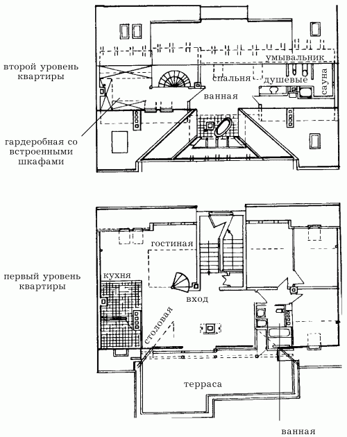 На рисунке 101 показан план расположения тех или иных помещений на обоих уровнях чердачной квартиры.
