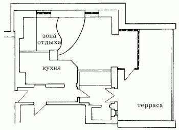 Итак, изначальный уровень пола сохранен только в кухне. Столовая поднята на 25 см, помост высотой 50 см соединяет ее с 75-сантиметровым уровнем зоны отдыха. Необходимо отметить следующую немаловажную деталь: все помосты сколочены из досок и покрыты настилом и, следовательно, могут быть легко разобраны в случае перепланировки мансарды.