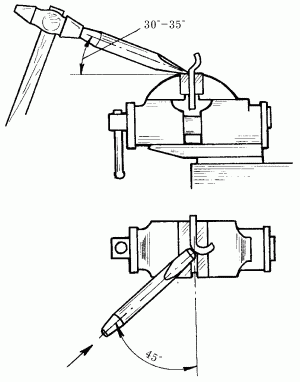 Рис. 16. Положение зубила при рубке заготовки в тисках.