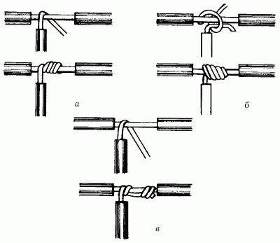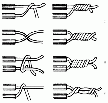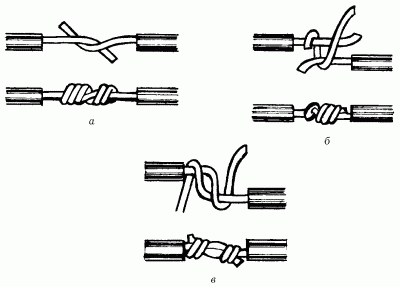 Рис. 21. Техника скрутки при соединении ответвлений: а – простая скрутка; б – бандажная скрутка; в – скрутка желобком.