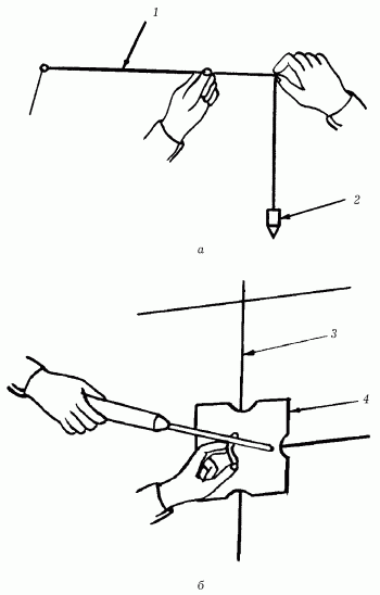 Рис. 26. Разметка трассы электропроводки с помощью: а – разметочного шнура с отвесом, б – шаблона: 1 – шнур разметочный; 2 – отвес; 3 – линия (трасса) электропроводки; 4 – шаблон.