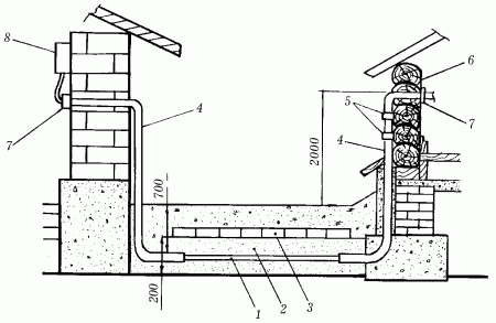 Рис. 41. Ввод кабельный в деревянное здание: 1 – кабель (прокладывается в траншее на глубине от поверхности земли не менее 0,7 м, в огороде – не менее 1 м); 2 – подсыпка из мелкого просеянного песка толщиной не менее 10 см; 3 – кирпич, уложенный поперек траншеи на утрамбованную подсыпку (в местах возможного механического повреждения кабеля); 4 – стальная труба; 5 – скобы; 6 – стена дома деревянная; 7 – втулка фарфоровая; 8 – электросчетчик.