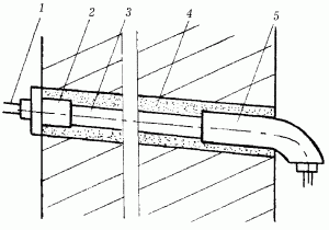 Рис. 42. Проход провода ввода через стену: 1 – провод ввода; 2 – втулка; 3 – изоляционная трубка; 4 – цементный или алебастровый раствор; 5 – фарфоровая воронка.