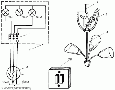 Рис. 52. Электрическая схема подключения трех ламп люстры: SB – выключатель двухполюсной; HL1–HL3 – электрические лампы накаливания; 1 – колодка клеммная люстровая; 2 – контактные зажимы выключателя; 3 – крюк для подвешивания люстры; 4 – люстра.