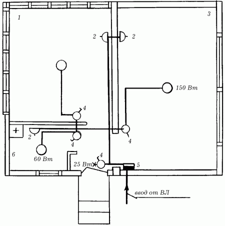 На ответвлении от питающей воздушной линии (до ввода проводов в счетчик) устанавливаются аппараты защиты (автоматический выключатель или два плавких предохранителя – на фазном и нулевом проводах). Ввод осуществляется от ВЛ с торцевой стороны дома кабелем марки АНРГ сечением 2 x 4 мм2. Групповая сеть внутри дома выполняется проводом марки АППР сечением 2 х 2,5 мм2 открыто. Общая длина внутренней электропроводки для однокомнатного дома составляет 27 м, а для двухкомнатного – 35 м. Оптимальная мощность для садового дома составляет 1 кВт. На рис. 56 показана электропроводка в приусадебных хозпостройках (вид в плане).