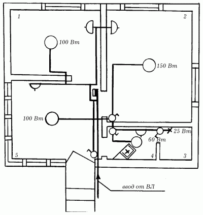 Цифры у светильников обозначают минимально необходимую мощность электрических ламп накаливания. На стенке около кладовой и в прихожей устанавливаются настенные патроны с электрической лампой мощностью 25 Вт. На кухне, веранде и в комнатах предусматриваются штепсельные розетки.