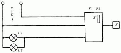 Рис. 57. Схема светильника с сенсорным регулятором мощности: Н1, Н2 – лампы накаливания; Е – регулятор освещенности; S – сенсорный контакт; F1 – основной предохранитель; F2 – запасной предохранитель.