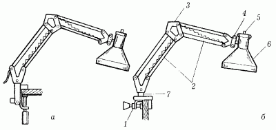 Рис. 58. Светильник с пантографной системой: а – крепление к горизонтальной поверхности; б – крепление к вертикальной поверхности: 1 – струбцина; 2 – подвижная ножка; 3 – пантографная система; 4 – винтовой зажим; 5 – выключатель; 6 – отражатель; 7 – кронштейн.