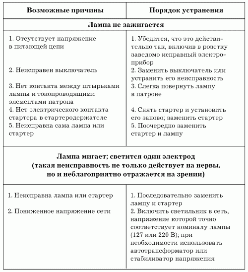 Вообще, большинство неисправностей люминесцентного светильника нельзя исправить в бытовых условиях и только некоторые из них можно устранить самостоятельно (табл. 7).