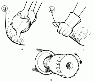 Рис. 79. Правила обращения с горящими проводами, находящимися под напряжением: а – неправильные действия; б, в – правильные действия.