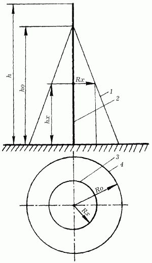 Рис. 82. Зона защиты одиночного стержневого молниеотвода: 1 – граница зоны защиты молниеотвода; 2 – молниеотвод; 3 – зона защиты на уровне высоты hx защищаемого объекта; 4 – граница зоны защиты на уровне земли.