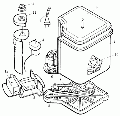 Рис. 88. Устройство стиральной машины типа СМ: 1 – стиральный бак; 2 – крышка бака; 3 – ручка реле времени; 4 – реле времени; 5 – конденсатор; 6 – электродвигатель; 7 – шнур; 8 – ременная передача; 9 – шкив; 10 – активатор; 11 – крышка со шкалой; 12 – тепловое реле.