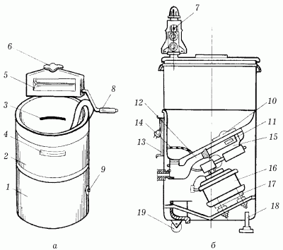 Рис. 89. Устройство стиральной машины типа СМР: а – общий вид; б – продольный разрез; 1 – корпус; 2 – стиральный бак; 3 – уровень заполнения бака водой; 4 – ручка; 5 – валики ручного отжима; 6 – регулировочный винт отжима; 7 – пружина; 8 – рукоятка отжимного устройства; 9 – реле; 10 – активатор; 11, 12 – сливной и соединительные шланги; 13 – шнур; 14 – решетка; 15 – насос; 16 – электродвигатель; 17 – рама; 18 – скоба для удержания машины при отжиме; 19 – ролик.