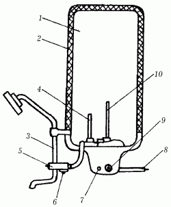 Рис. 93. Устройство электроводонагревателя типа ЭВАН: 1 – емкость для воды; 2 – теплоизоляционный кожух; 3 – трубка смесителя; 4 – терморегулятор; 5 – смеситель; 6 – патрубок для ввода холодной воды; 7 – сигнальная лампа; 8 – электрошнур; 9 – ручка регулятора температуры; 10 – ТЭН.