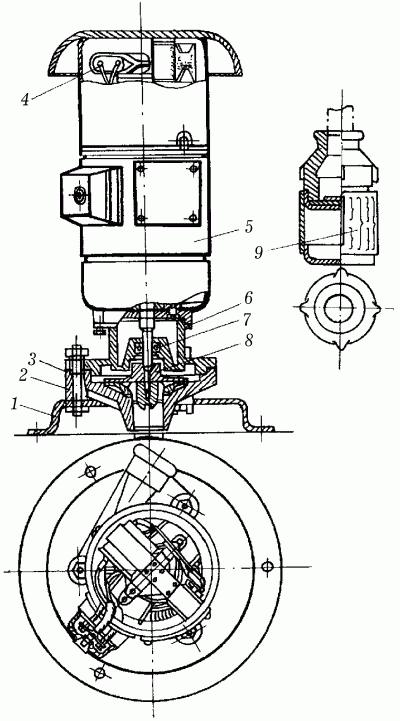 Рис. 95. Электронасос центробежного типа «Кама»: 1 – подставка; 2 – основание корпуса; 3 – прокладка; 4 – помехоподавляющее устройство; 5 – электродвигатель; 6 – крышка насоса; 7 – сальник; 8 – рабочее колесо; 9 – приемное устройство.