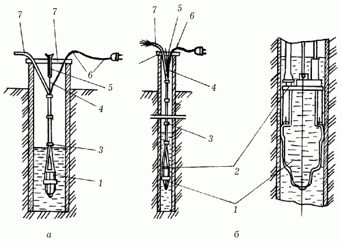 Рис. 96. Установка электронасоса вибрационного типа: а – в обсадной трубе скважины; б – в колодце; 1 – насос; 2 – кольцо; 3 – связка провода со шлангом; 4 – капроновая подвеска; 5 – пружинная подвеска; 6 – провод; 7 – шланг.