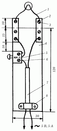 Рис. 101. Устройство для удаления изоляции с монтажных проводов: 1 – нихромовая проволока; 2 – держатель; 3 – винт; 4 – текстолитовая пластина; 5 – кнопка; 6 – винт; 7 – токопроводящие провода; 8 – хомут.