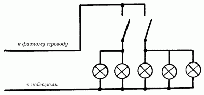 Спаренные чаще всего используют для пятирожковых светильников, когда одна клавиша включает две лампочки, другая – три, а обе – все пять (рис. 8).