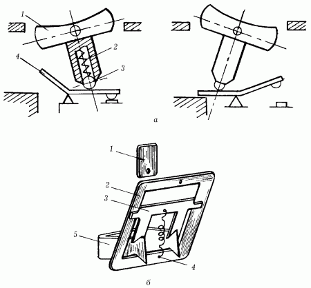 Рис. 9. Конструкция механизмов выключателей: а – качающийся механизм выключателя с пружиной сжатия: 1 – клавиша; 2 – пружина; 3 – шарик; 4 – коромысло; б – качающийся механизм выключателя с пружиной растяжения: 1 – контактная пластина; 2 – рамка; 3 – скоба; 4 – пружина; 5 – основание.