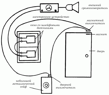 Рис. 110. Устройство сигнализации с контактными датчиками разных типов.