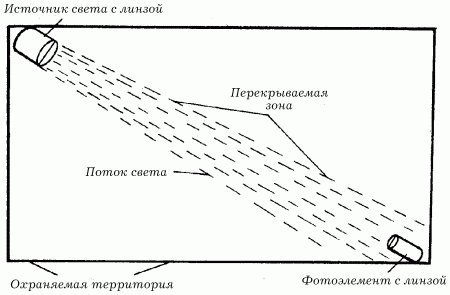 На одном конце охраняемой территории устанавливается источник света, который освещает фотоэлемент, расположенный на противоположном конце территории. Датчик работает в режиме ожидания до тех пор, пока поток света, попадающий на фотоэлемент, не будет пресечен: например, нарушитель перекроет его своим телом. В таком случае сработает сигнализация.