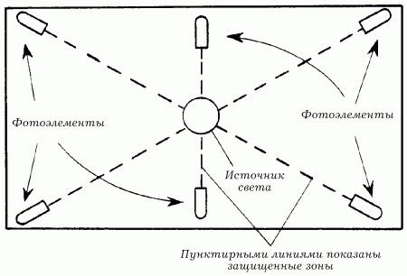 На рис. 112 представлена многосенсорная система, позволяющая контролировать большую территорию, разбитую на отдельные секторы по числу фотоэлементов. При этом единственный источник света находится в центре охраняемой территории. Для охраны небольшого объекта (например, сейфа или других металлических предметов) может применяться детектор близости – устройство, реагирующее на приближение кого-либо. Рис. 113 показывает использование данного средства для охраны сейфа.