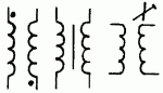 – трансформаторы (число полуокружностей равно четырем); жирными точками обозначают начало подключения выводов; магнитопровод, общий для всех обмоток, изображают между их символами, а если каждая из обмоток имеет свой магнитопровод – над ними.